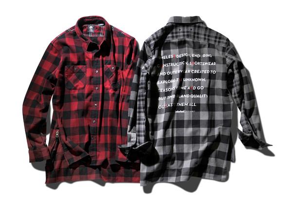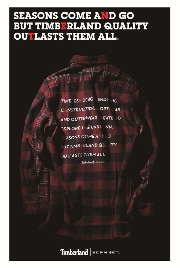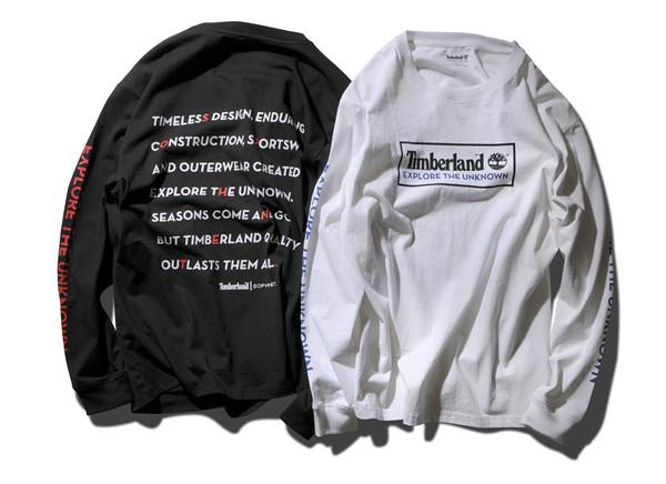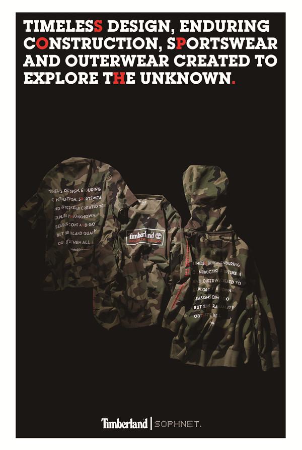 取名为『Explore The Unknown探索未知』的联名系列,灵感来自于上世纪90年代经典Timberland服装风格,SOPHNET重新设计从传统的户外服装融入当代的轮廓,取材自怀旧的90年代风格印刷字体,创造出引人注目的视觉图形。面料采用优质纯棉,精巧的设计细节,体现SOPHNET特有的标示,例如:前、侧缝拉链和透气孔等。此系列包括拥有时髦的超大字体图案的半拉链帽衫,SOPHNET特有的方块纹或是格纹法兰绒衬衫等,包含一组oversize长袖T恤及oversize的短袖T恤。