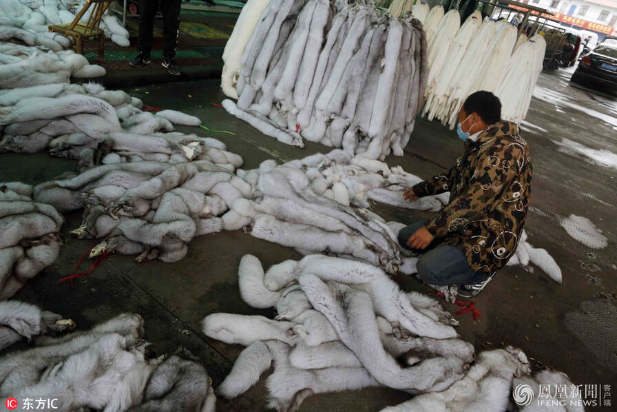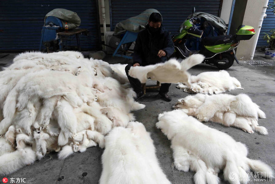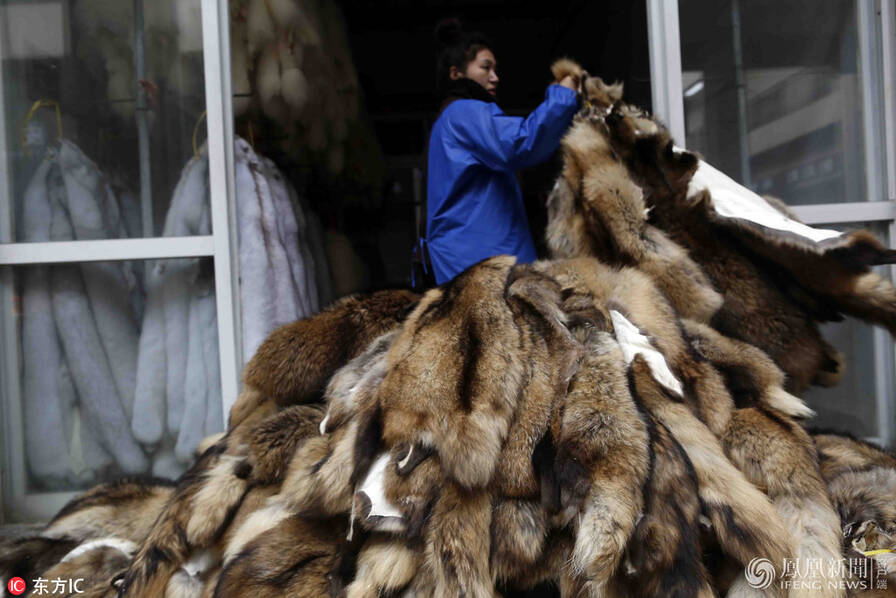 皮草交易在国际上一直充满争议。2008年1月,近200名动物保护主义者裸体出现在西班牙巴塞罗那大教堂前,向人们展示制作一件皮草大衣需要多少动物,希望以此提醒大家皮草背后隐藏的残酷交易。图为崇福皮草市场过道上,一名工人清点需要加工皮草的数量。