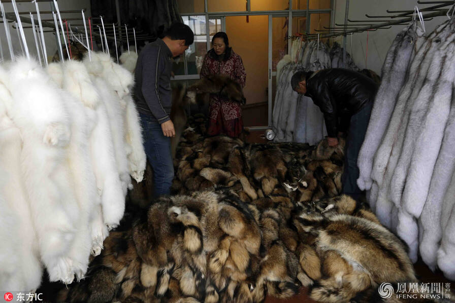2005年,崇福镇被授予“中国皮草名镇”的称号,2008年又被授予“中国皮草名城”图为一商户将面前的狐狸皮草按质地分成5等。