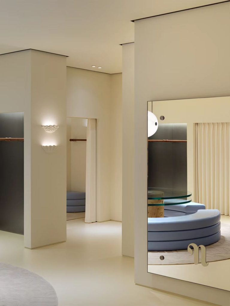 在上海环贸iAMP店的设计上,Nanushka 也延续了品牌一贯的布达佩斯美学。在装修上以舒适温馨为特色,整体空间以奶油色系为主,门店中央摆放着蓝色皮质圆形沙发,试衣区装饰着贝壳形内嵌壁龛。