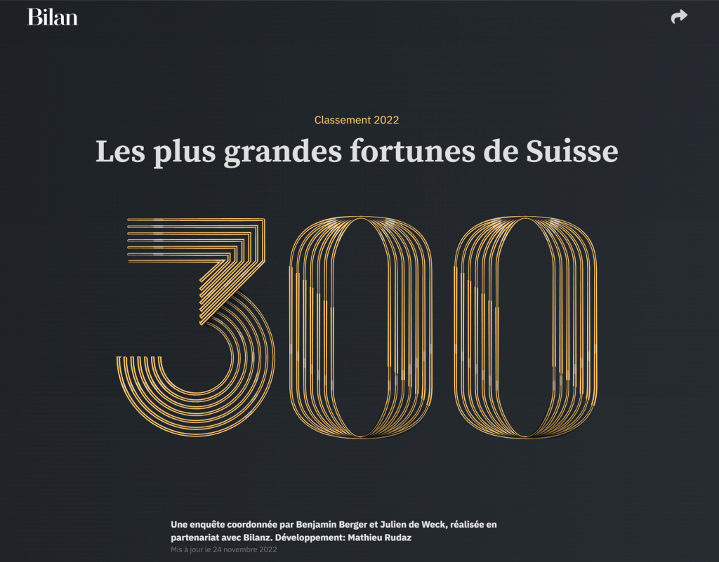 《Bilan》杂志每年都会公布瑞士前300富豪排行榜。所有入选者都必须拥有至少60亿瑞士法郎的资产,且榜单上四分之一的富豪都在瑞士居住。