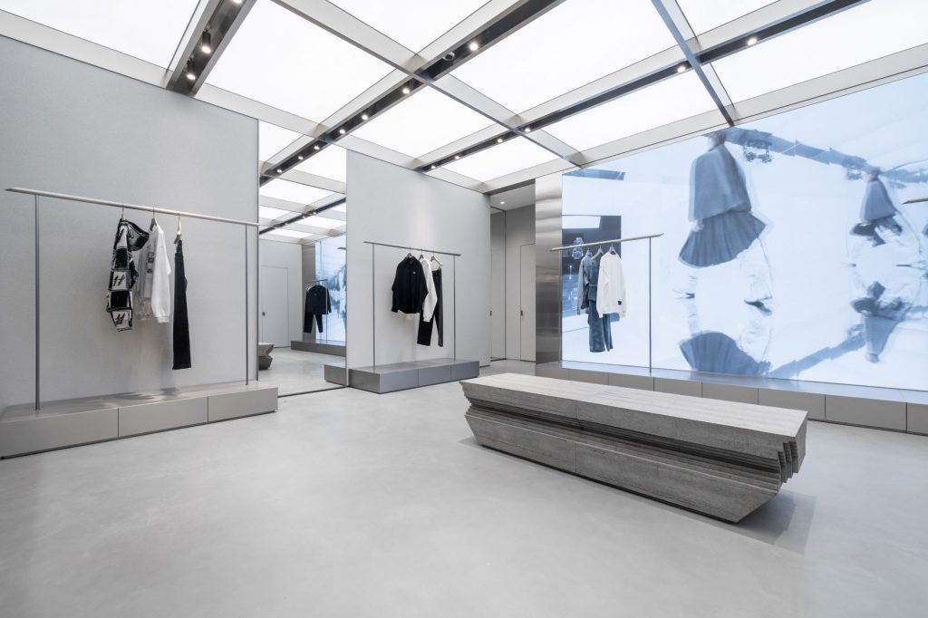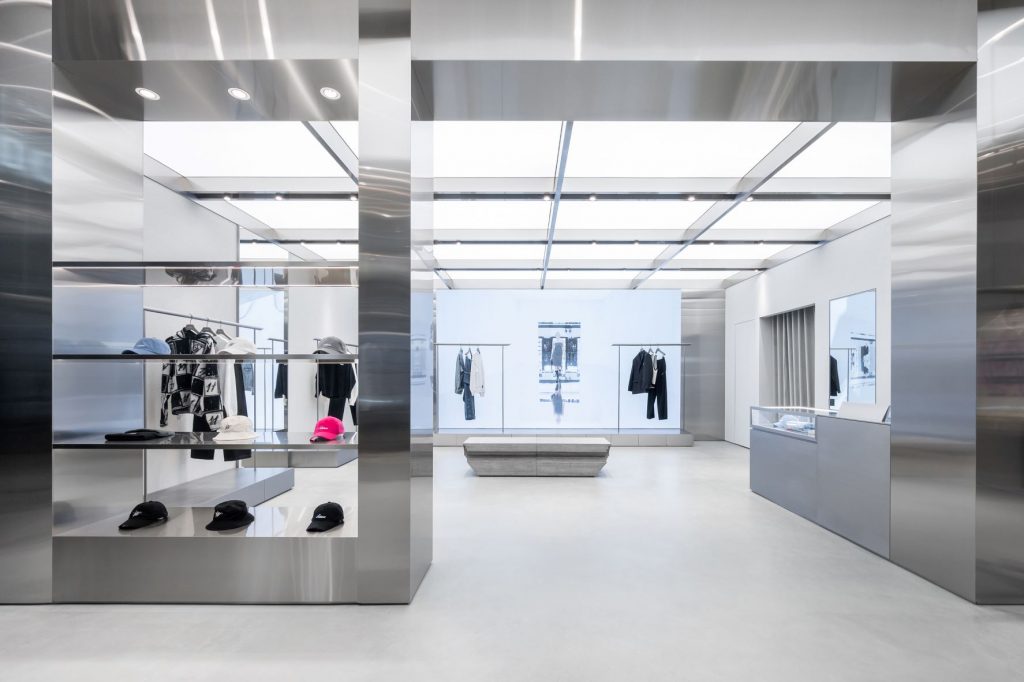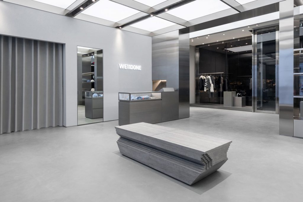 门店面积有 137 平方米,设计上以当代极简理念呈现,渐进式的布局并融入了落地玻璃幕墙、拉丝不锈钢、水泥等各种材质,这也是目前 WE11DONE 标志性的门店风格。
