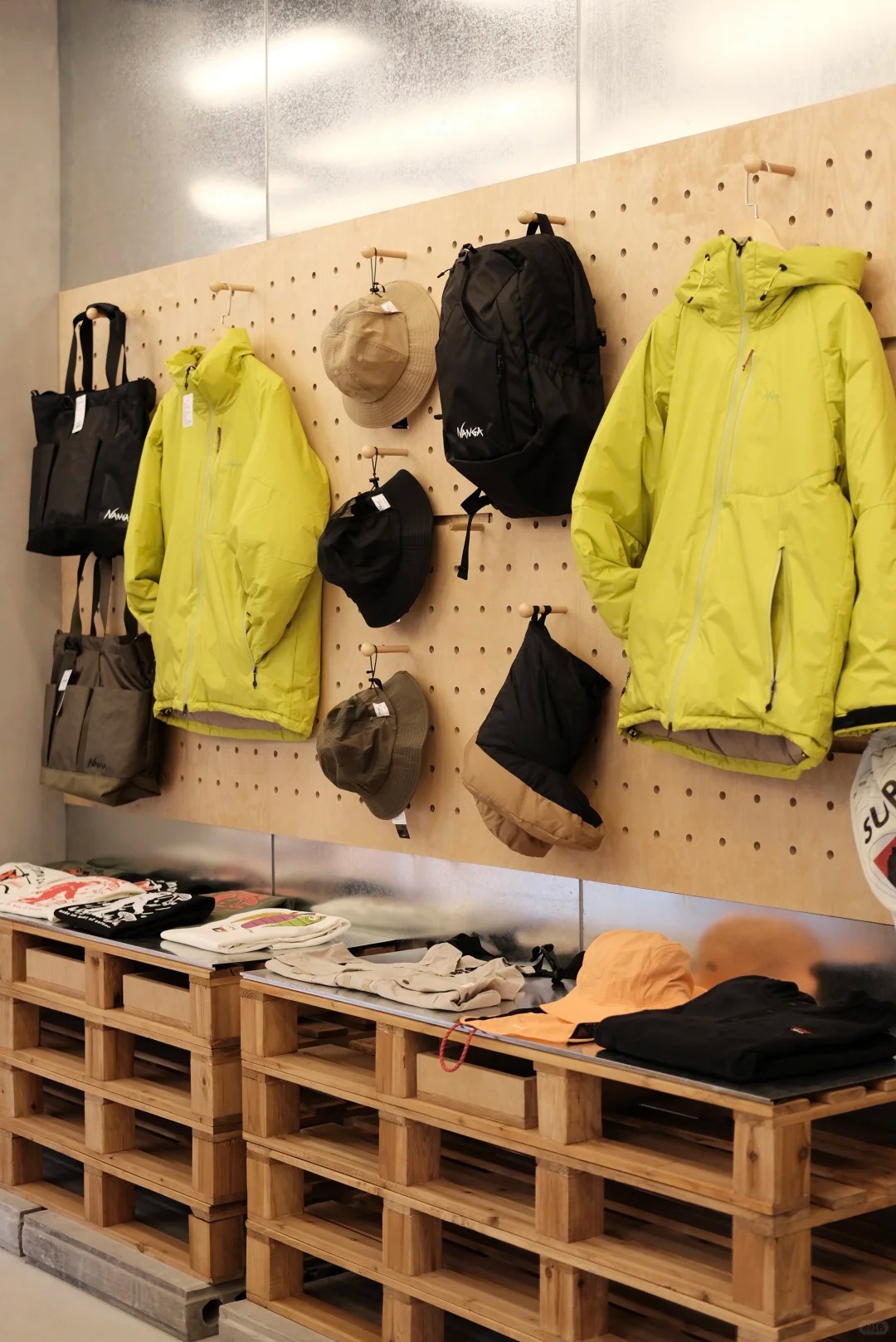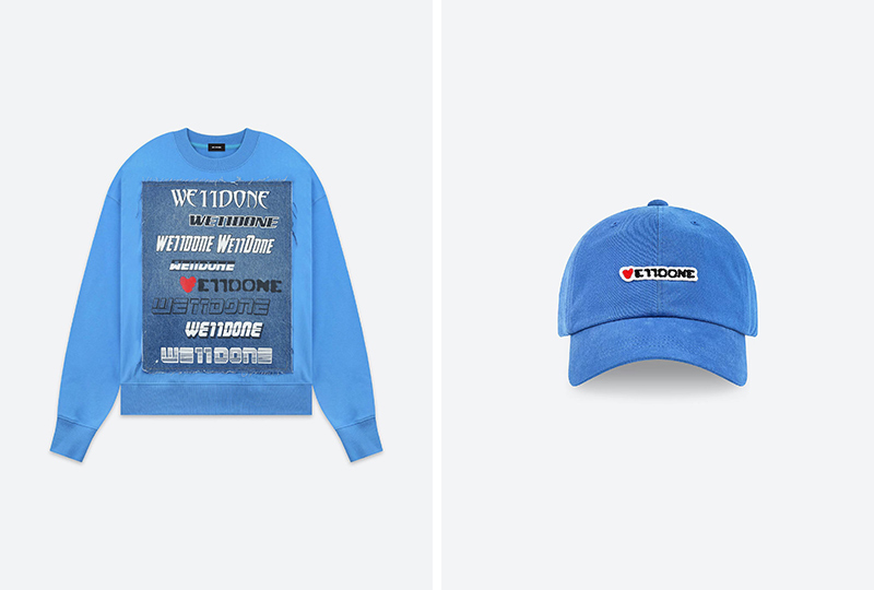 目前店内陈列的是 2022 秋冬系列发布秀上的廓形外套及多套秀款时装,同时作为新店开业的传统,这里也有准备独家产品(蓝色弹幕 logo 印花拼接卫衣及同色棒球帽)。