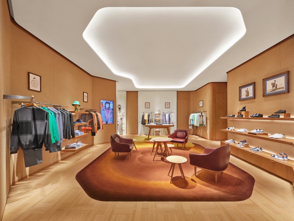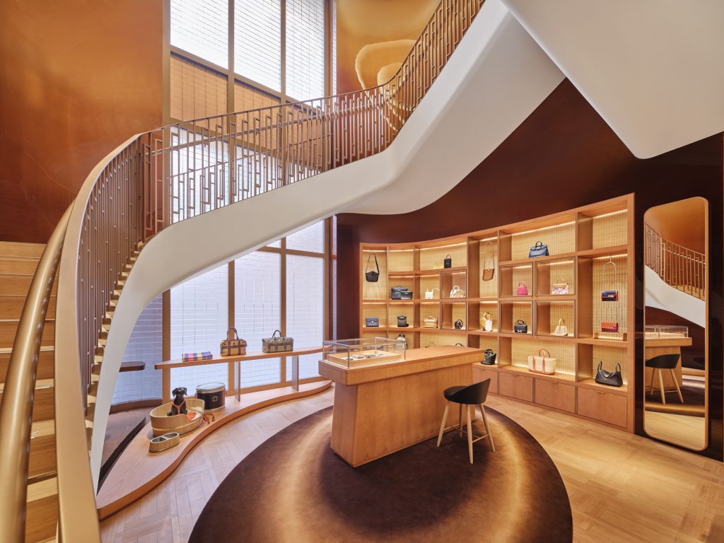 从一层入口的男士和女士丝巾开始,男士成衣区域、美妆、香水、时尚配饰井然排布。移步至店铺中央,楼梯周边环绕着马术与皮具作品,二层是女士成衣、家居以及珠宝腕表空间。