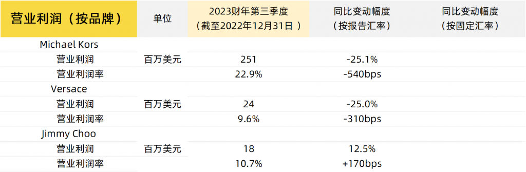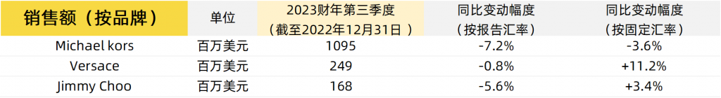 Michael Kors第三季度销售额同比下降7.2%至10.95亿美元,按固定汇率计算下降3.6%。今年1月,集团宣布任命 Cedric Wilmotte 为 Michael Kors 的首席执行官,自2023年4月3日起生效。