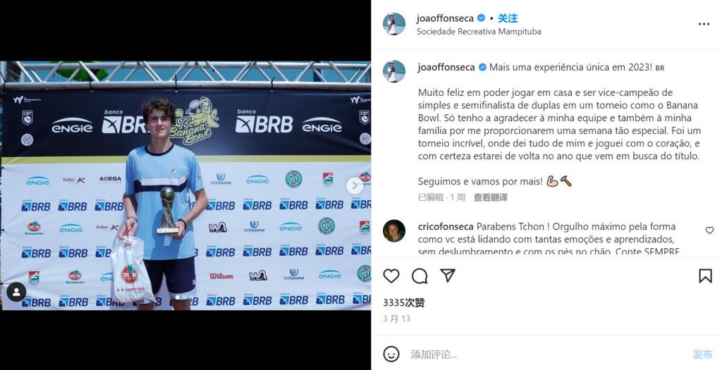 除 Iga Świątek 与 Ben Shelton 外,On 还宣布签下16岁巴西网球小将 João Fonseca(上图),这位后起之秀目前在 ITF(国际网球联合会)青少年排名中位列第9,曾于2022年以6胜0负的单打战绩,带领巴西队首夺青少年戴维斯杯冠军。2023年,他于里约公开赛上首次亮相 ATP 正赛;并随后晋级2023年澳网男单四分之一决赛,同时打入2023年澳网男子双打决赛。