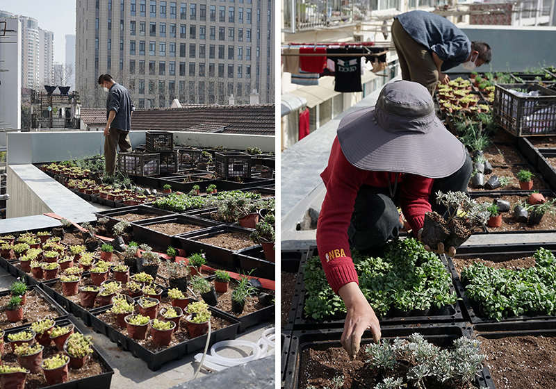 此外,大型屋顶开口为建筑带来了充足的自然采光,3 层楼高也保持了通透感。而店铺屋顶还有和“城市荒野”的合作,这里种上了大量上海本土的植物,它们会被有机打理并向邻居和社区开放,成为一个社区当中的交流空间。