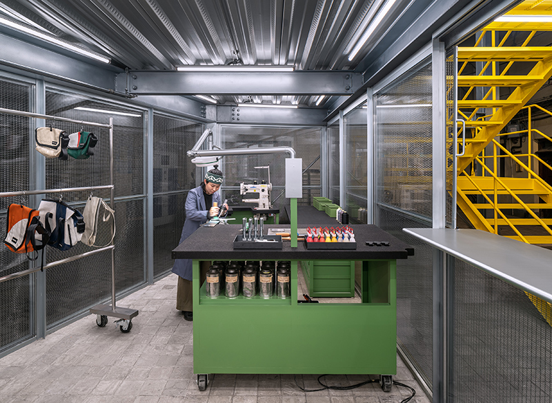 这一切都和 FREITAG 品牌本身的定位和态度相呼应,FREITAG 基于卡车篷布的产品本身就强调着循环再利用以及够长的使用寿命——在这次的旗舰店里,1 楼就有专门的维修工作区,这里有 FREITAG“包袋医生”对来自中国各地的包袋进行修复,从而延长产品使用寿命。