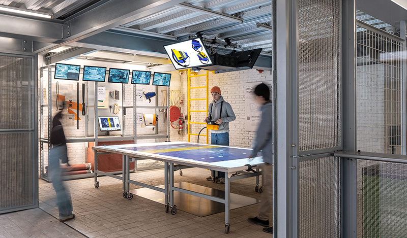 在 1 楼还有工作坊空间,这里提供了数字化定制工具 F-Cut 的线下体验,让顾客可以直观地感受生产一款 FREITAG“独一无二”的产品的过程。而在 2 和 3 楼做了大规模的产品陈列——约 900 只包袋、750 个配件,对于 FREITAG 的粉丝来说这会是非常过瘾的体验。