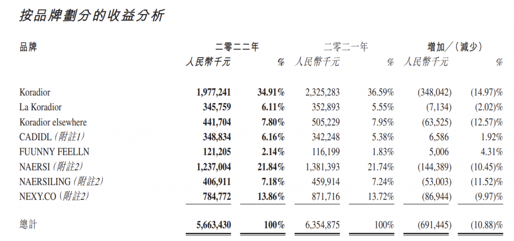 根据财报,Koradior及NAERSI 2022年销售收入均超过12亿元,其中Koradior近20亿元;Koradior elsewhere、La Koradior、NAERSILING、NEXY.CO、CADIDL 等品牌销售额普遍在3-8亿元之间;FUUNNY FEELLN也是集团表现最好的品牌,2022年销售收入同比增长4.31%至1.21亿元。