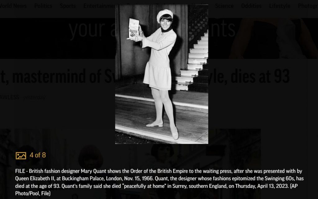 Mary Quant 是同名品牌的创始人,以二十世纪六十年代风靡全球的迷你裙(Mini Skirt)闻名于世,她的家人在讣告中称其为“20世纪最受国际认可的时装设计师之一,也是一位杰出的创新者”。