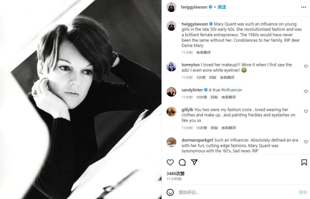 同样成名于 Swinging Sixties 时期的著名模特 Twiggy Lawson 在个人 Instagram 怀念道(下图),Mary Quant“对50年代末60年代初的年轻女孩产生了巨大影响……她彻底改变了时尚,是一位才华横溢的女企业家。没有她,1960年代会完全不同。”