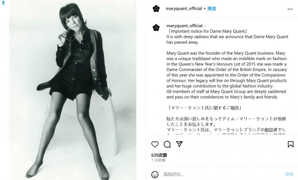 上图:Mary Quant 同名品牌于官方 Instagram 发布讣告