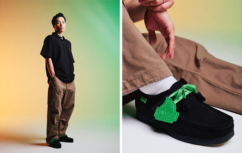 XLARGE 和 Clarks Originals 的首个联名系列正式发售。合作围绕后者标志性的 Wallabee 展开,最终鞋款的鞋面通体覆盖了黑色麂皮,鞋领位置饰有绿底 XLARGE logo,搭配绿色鞋带,鞋带头则有黑色流苏装饰。 和 Clarks Originals 标志性的三角吊牌一道,联名鞋款还配有绿色 OG 大猩猩皮牌。