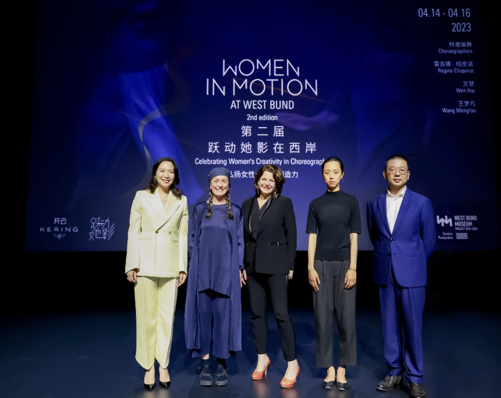 上图左起:开云集团大中华区总裁蔡金青,编舞家 Régine Chopinot,蓬皮杜中心表演艺术部门负责人 Chloé Sigano,新锐舞者与剧场创作者王梦凡,西岸美术馆执行馆长陈安达