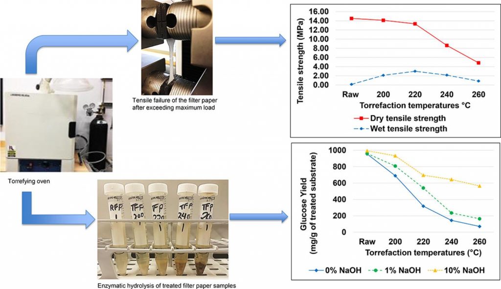 这种更强的产品可以看到一个纸袋在使用后忍受着湿的和干的,然而,扭结降低了它作为生物燃料产品的效用,大大降低了产品的葡萄糖产量。为了解决这个问题,研究人员用碱性的氢氧化钠溶液处理纸张。纸张从690mg/g的生物质基质(在392°F的火化温度下)变成了933mg/g的10%碱性处理。