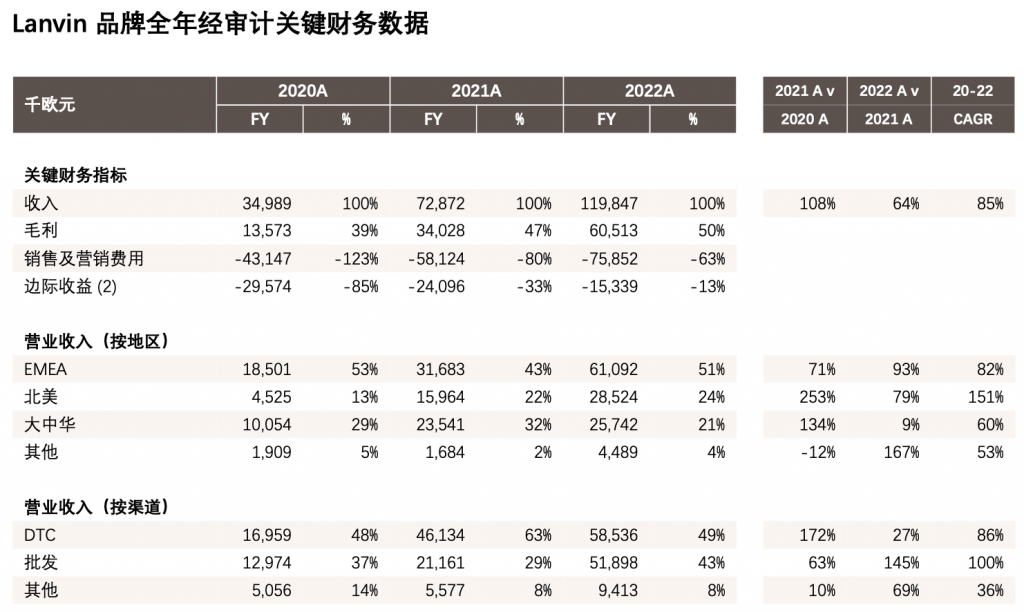 4月20日,继2月发布初步业绩后,全球时尚奢侈品集团 Lanvin Group(复朗集团)(纽交所代码:LANV)公布了2022年全年财报:整体营收同比增长37%至4.22 亿欧元,维持了自2020年以来的强劲增长势头,复合年增长率达38%;盈利能力持续改善,毛利润大增40%至2.38亿欧元,较2020年的1.17亿欧元提升了一倍以上 ;毛利率攀升至56%。所有品牌、所有渠道和所有区域市场均实现增长,尽管受到疫情影响,大中华市场仍逆势增长15%。
