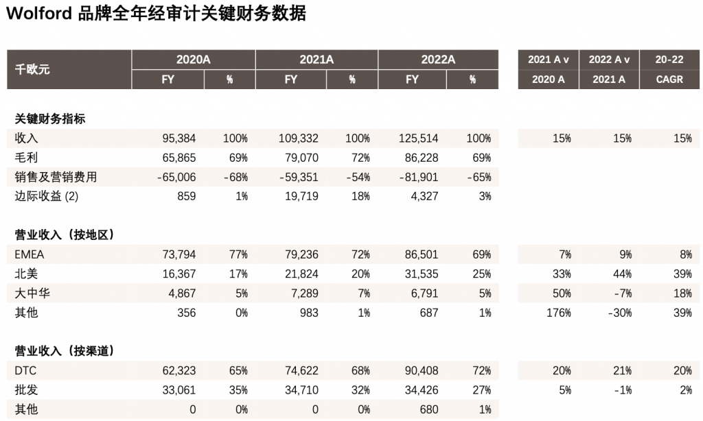 集团于2021年7月正式收购意大利奢侈鞋履品牌 Sergio Rossi。截至2022年,Sergio Rossi毛利率已从46%提升至 50%。毛利率的提高得益于更高比例的DTC渠道销售。由于收购后品牌在人才、营销和店铺租赁等方面投入的增加,边际收益在 2022 年从13%略微下降至11%。