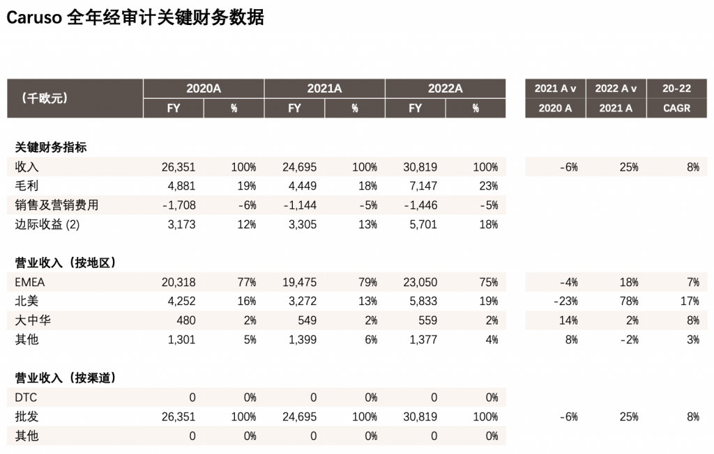 Caruso 在2022年继续表现稳定,毛利润从400万欧元增长至700万欧元,毛利率也从18%提升至23%。同时,边际收益从300万欧元增长到600万欧元,边际收益率从13%显著提升至18%。Caruso 通过不断赢得新的生产客户,以及对现有客户进行更深入的渗透,不断增强规模效应,加上对于工厂生产成本以及营销费用的管理优化,成功提升了盈利能力。