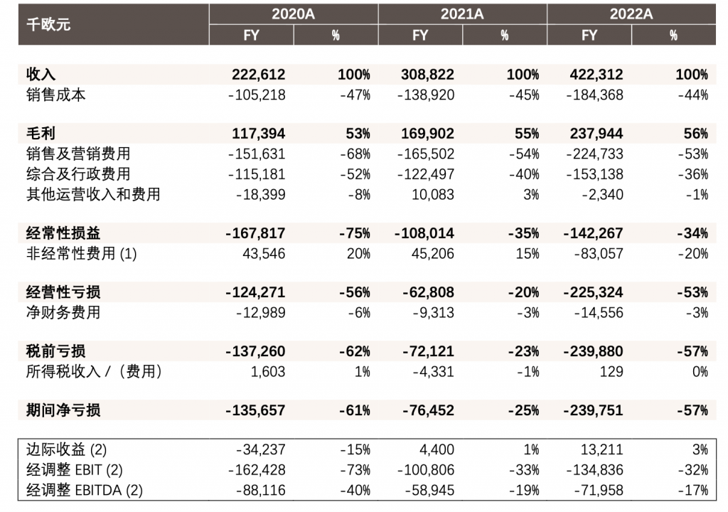 2022年度录得毛利润6100万欧元,毛利率由上一年的47%增加至50%。毛利率的提升主要来自于所有产品品类售罄率的提高,以及规模效应带来的成本优化。边际收益也持续改善,由2021年的负2400万欧元收窄至负1500万欧元,占收入比例从–33% 优化至–13%,同比提升了20个百分点。