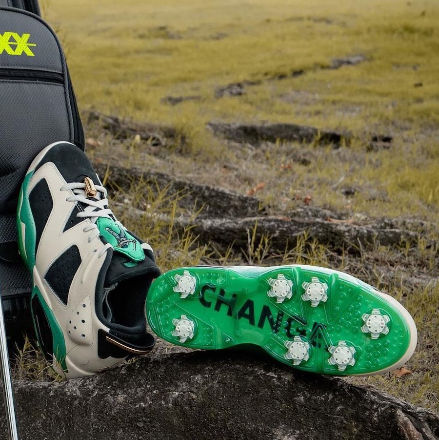 这双低帮版 Air Jordan 6 以白色和海军蓝组合,同时加入了亮眼的绿色点缀。鞋舌上有 Eastside Golf logo 刺绣,透明外底则加入了高尔夫球鞋底,利于在外场挥杆。