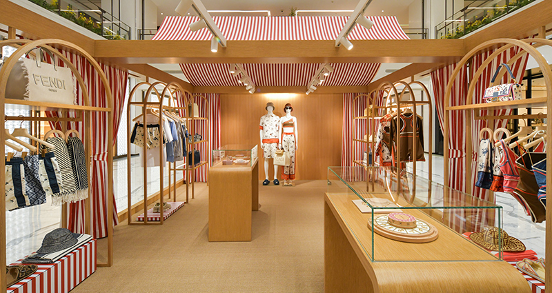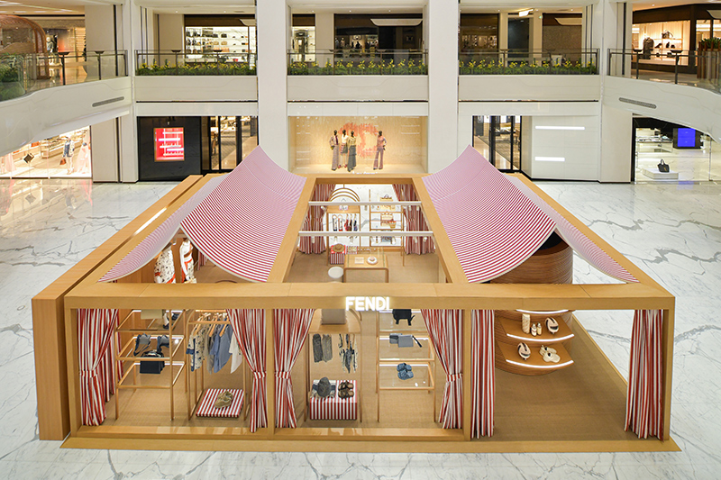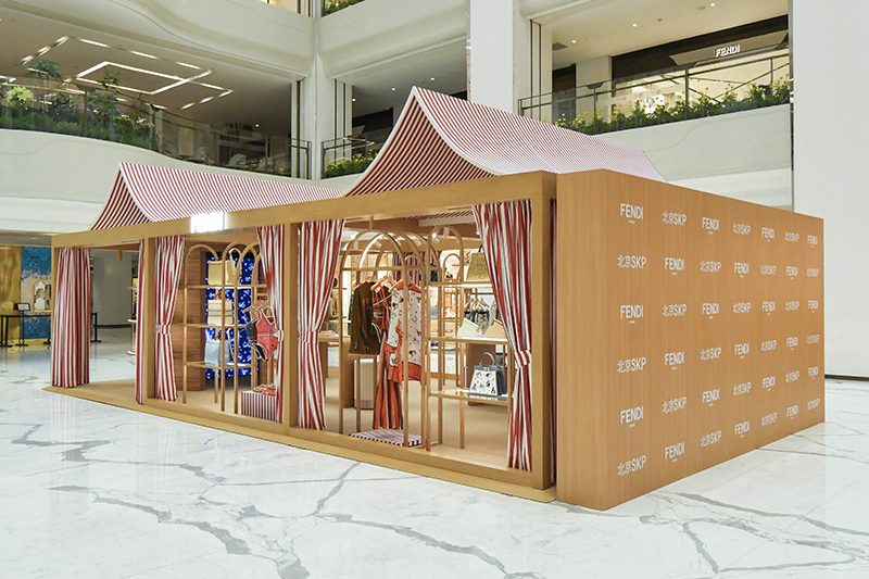 这次限时店以橡木搭建成凉亭结构,它有着天然木质纹理,顶部的红白 Pequin 条纹帆布趣味十足,同时空间中还有大量的拱门元素,这呼应了 FENDI 的罗马总部意大利文化宫。