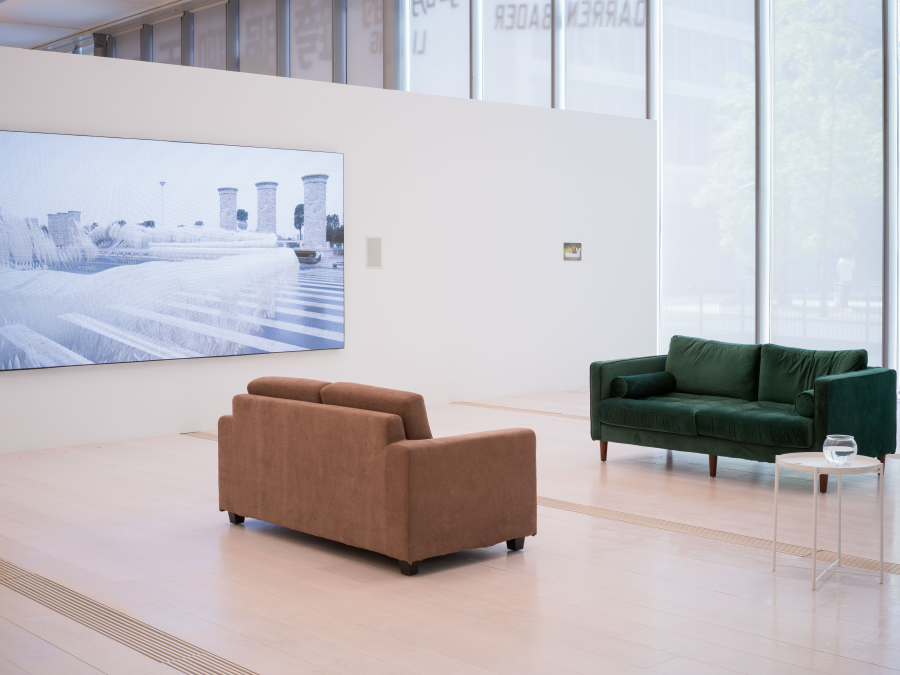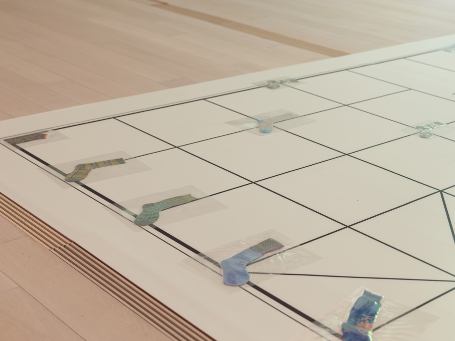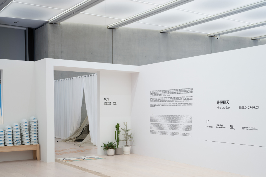 而就在水镜广场一侧的 BY ART MATTERS 天目里美术馆,还有一场 JNBY 赞助并参与的展览。艺术家达伦·贝德(Darren Bader)以 3 件 JNBY 的现成物品为“原料”展开了创作——JNBY 的袜子成为中国象棋的一部分,衣服的领标被印上了诗句,店铺的一对沙发被搬入了这间“401 号公寓”。现成品的角色与功能在此发生变化,但美术馆不是它们旅程的终点。
