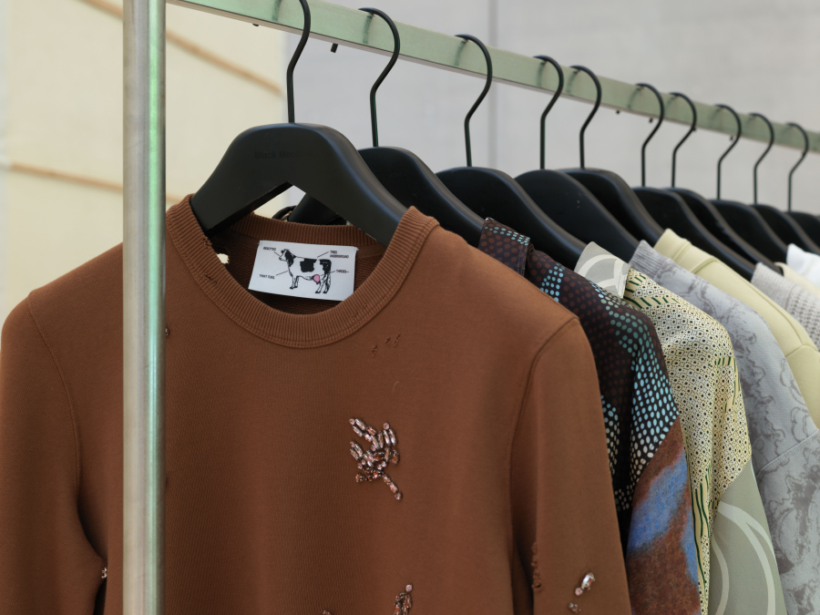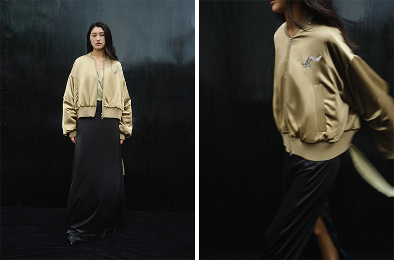 另外 JNBY 还带来了一个非遗苏绣限定系列,这是和薛氏刺绣传承人薛金娣、张雪合作的。利用独创的捻丝盘线刺绣方法,在服装上呈现了格外立体迷人的刺绣纹样。