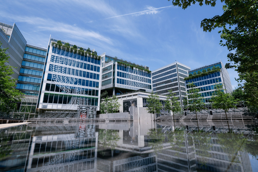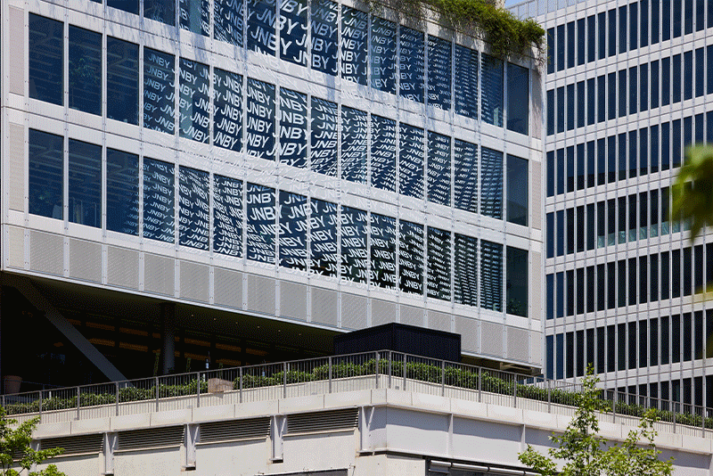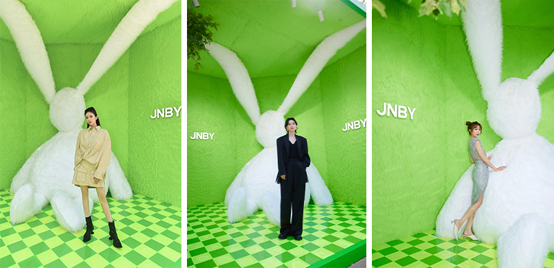 与此同时,JNBY 在水镜广场周围建筑的外墙上装点了用品牌 logo 打造的错视图案,四周还设置了多个独立的艺术打卡装置。