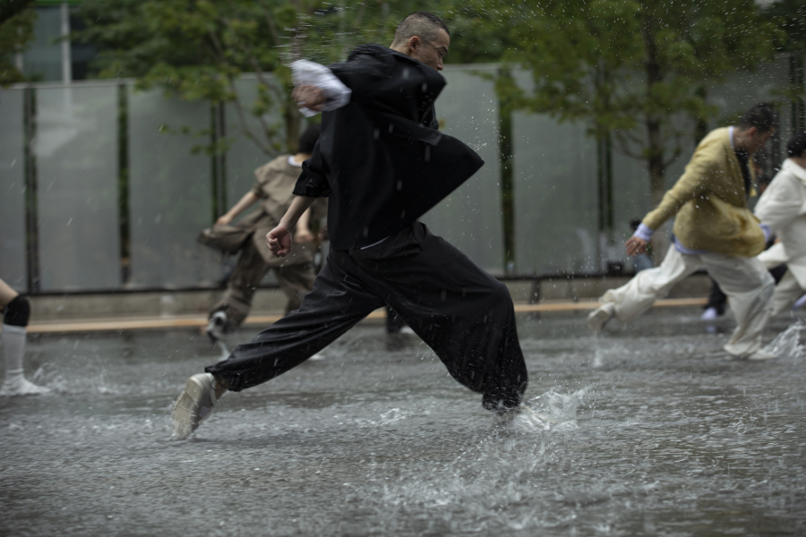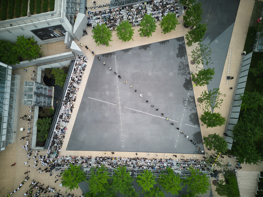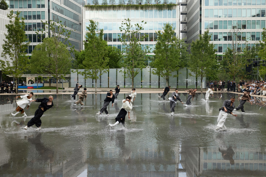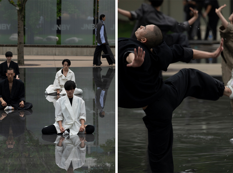 环绕水镜景观的步行道成为了天然的 T 台,而这层薄薄的水面则化身成为舞台。JNBY 再次和陶身体剧场展开合作,水舞台之上上演了陶身体“数位系列”新作《14》中的片段。
