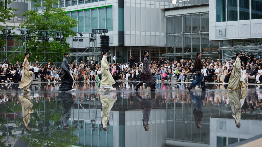 系列以“片刻”为主题,秀场设置在天目里中央的水镜广场,这一景观是西班牙著名的水景设计团队 JML Water Feature Design 的作品,巨大的几何平面上覆有 2 厘米的薄薄水层,好似一层水质纱衣。