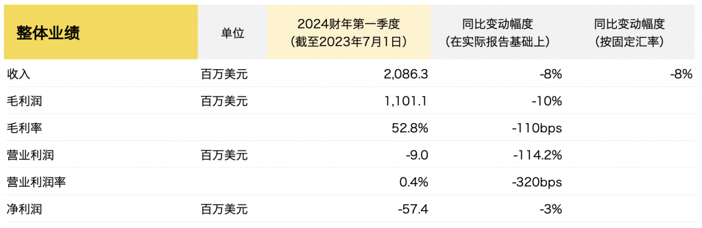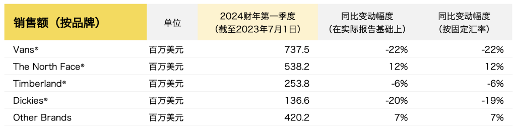 The North Face、Vans、Timberland、Supreme 等户外和潮流品牌的母公司、美国服饰巨头 VF Corporation (以下简称“VF”)公布了截至2023年7月1日的2024财年第一季度的关键财务数据:销售收入在报告基础和固定汇率上均同比下降8%,至20.86亿美元,净亏损进一步扩大至5740万美元。但得益于大中华区24%的增长,引领亚太地区进一步增长13%,是集团唯一实现增长的市场。