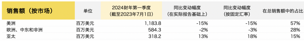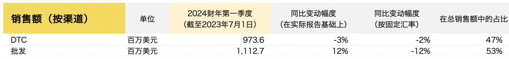 EMEA地区(欧洲、中东和非洲)收入同比下降2%,按固定汇率计算下降3%,主要是由于DTC渠道持续增长但批发渠道下降。