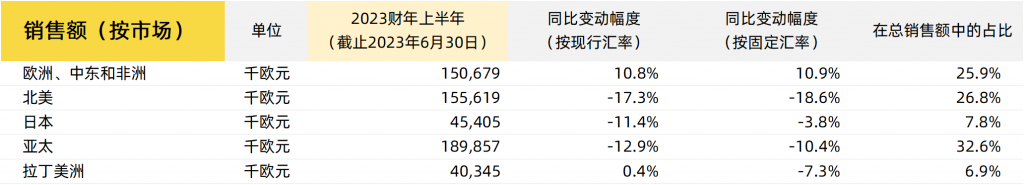 受韩国和旅游零售渠道表现疲软的影响,亚太地区的净销售额同比下降 12.9%,而大中华区的零售表现良好,亚太仍是集团第一大市场。