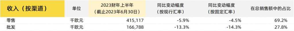 欧洲、中东和非洲地区表现优异,净销售额同比增长了 10.8%,零售和批发渠道均取得了积极的业绩。