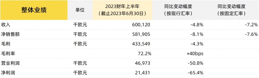 配饰同比下降0.6%至0.3亿欧元,以固定汇率计同比增长0.3%,是表现最好的品类。