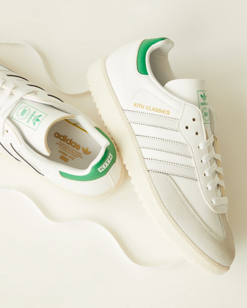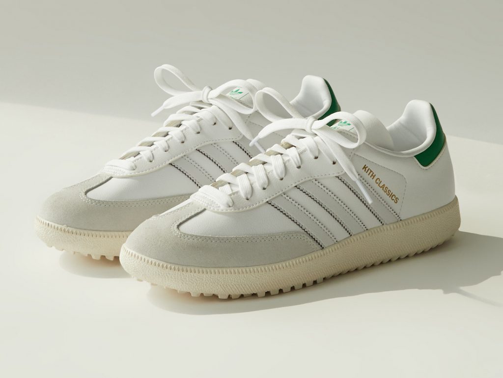 KITH 和 adidas 介绍了双方的最新合作项目,这次选择了 Samba 鞋款,并且在设计中加入了高尔夫球元素。鞋头处做了 T 字加强,搭配无钉橡胶外底,有更好的抓地性,更适合高尔夫球运动需求。 双方为它打造了两款配色,它们将在 8 月 7 日正式上市。