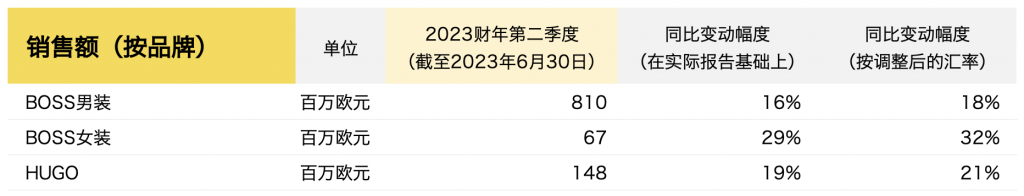 在2023春夏广告宣传的推动下,BOSS和HUGO在第二季度继续保持强劲的销售势头。因此,这两个品牌进一步扩大了全球市场份额,尤其是在年轻消费者中。最新的BOSS和HUGO系列的持续成功推动了所有分销渠道的强劲销售。