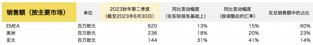 EMEA地区销售额经汇率调整后增长了15%。这一业绩主要得益于德国(+19%)和法国(+15%)等主要欧洲市场两位数的增长,而中东市场的增长势头也同样强劲。