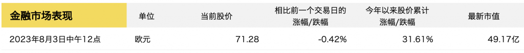 财报发布后,截至德国当地时间中午12点(北京时间晚6点),Hugo Boss集团股价较上一交易日出现轻微下跌,至71.28亿欧元/股。但今年以来,集团股价已经累计上涨逾31%,当前市值约为49亿欧元。