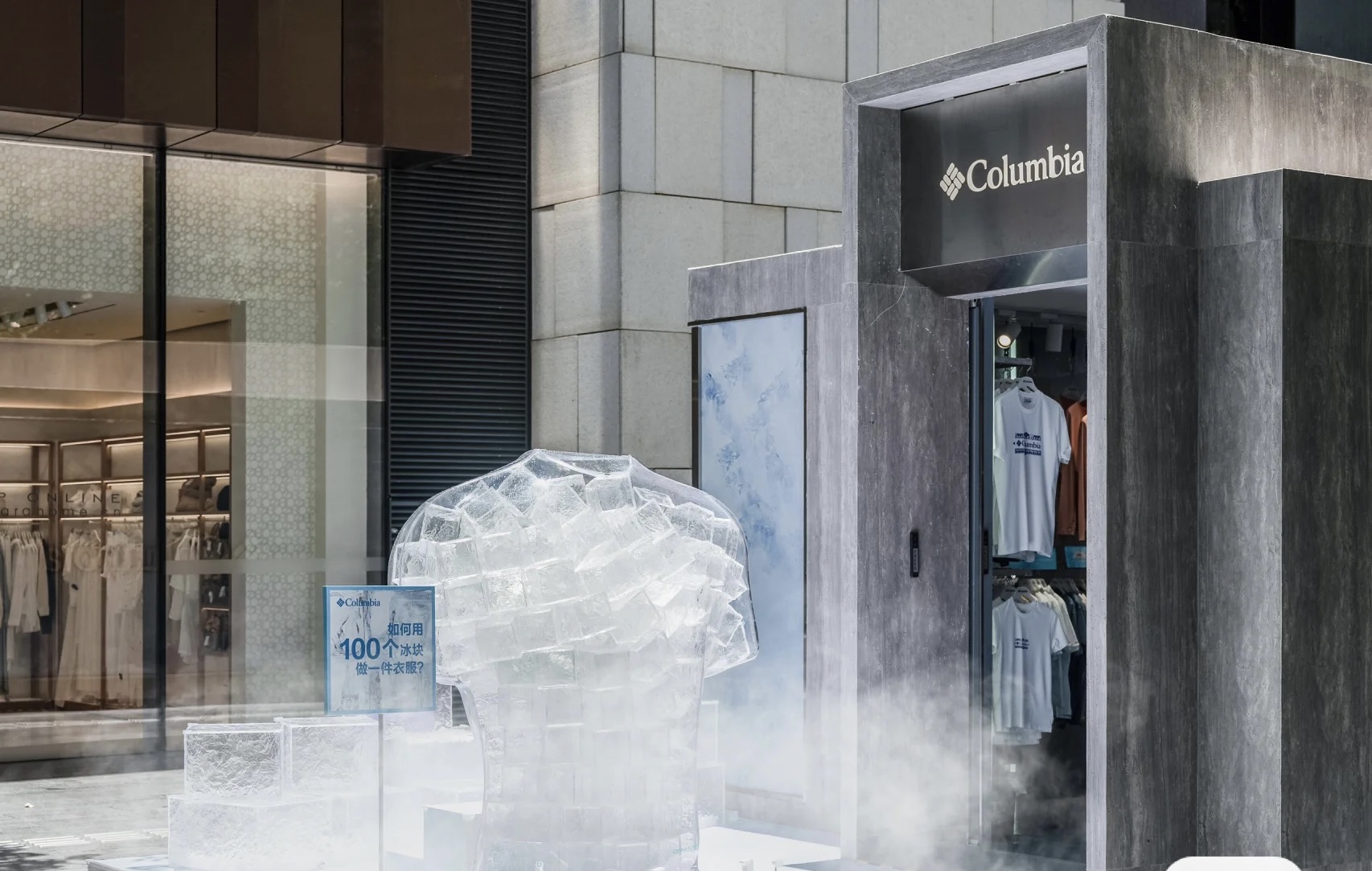 美国户外品牌 Columbia(哥伦比亚)在深圳万象天地举办“Columbia冰屋派对”快闪活动,其中品牌用100个冰块打造了巨型冰衣装置。