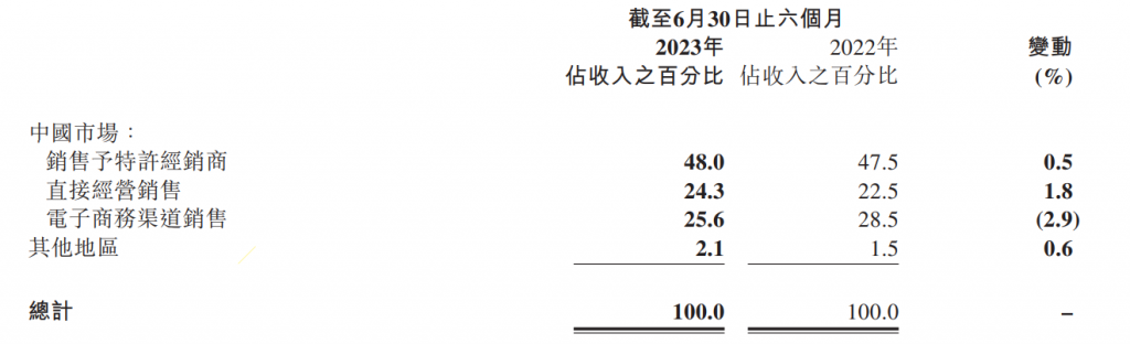 毛利率为48.8%(去年同期为50%)。主要是因为集团为促进消费,增加了线上渠道和零售终端的折扣力度;同时,毛利率较高的直面消费者渠道收入占比同比略有下降;以及存货拨备计提较去年同期增加。以上因素均对本期的毛利率产生不利影响