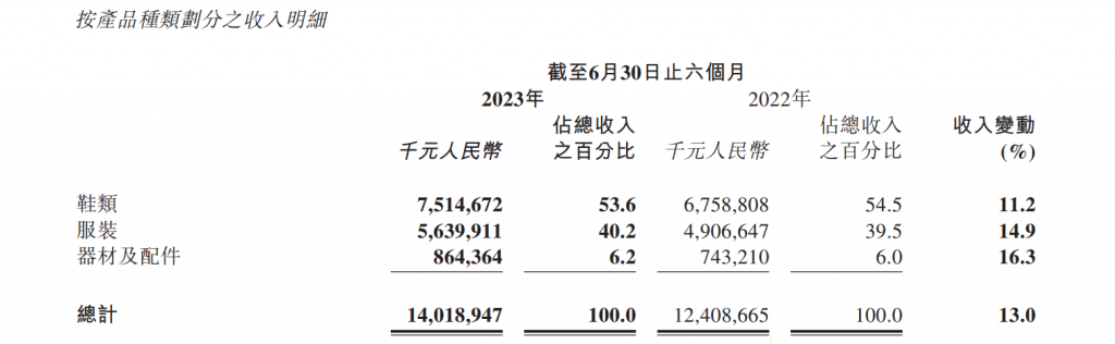 报告显示,2023上半年鞋类收入同比增长11.2%至75.15亿元,占集团总收入的53.6%;服装收入同比增加14.9%至56.4亿元;器材及配件收入为8.64亿元,同比增长16.3%。2021年鞋类收入占总收入的百分比为45.1%,低于服装类占比49.6%,2022年鞋类收入占比实现反超并在2023年保持领先。