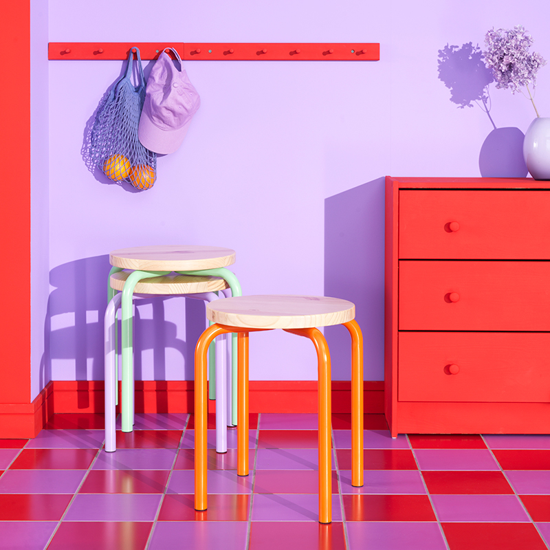 还有同样在上世纪 70 年代亮相的 JERRY 凳子(由 Karin Mobring 设计),这次改叫“DOMSTEN 多姆斯坦”。它采用了松木凳面,同时搭配糖果色的金属椅腿,并且它也延续了可堆叠的特点,有趣又实用。