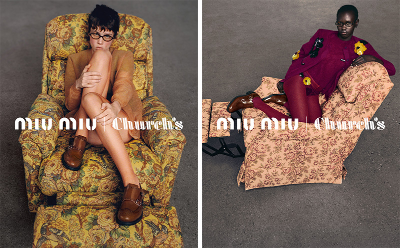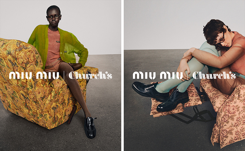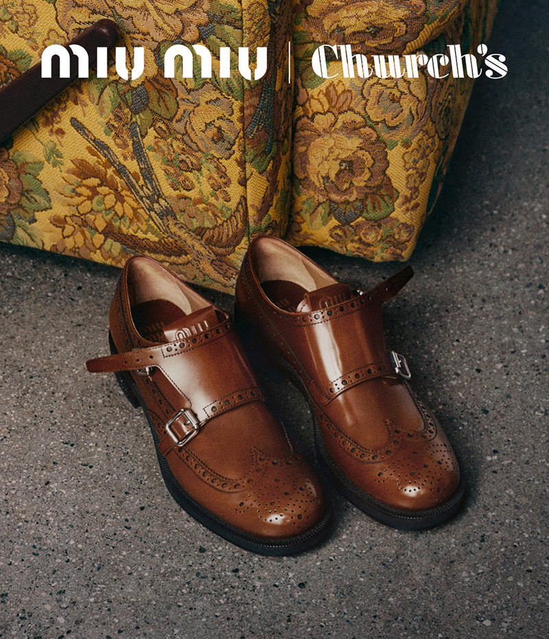 Miu Miu 介绍了和鞋履品牌 Church’s 共同带来的 2023 秋冬合作系列,系列有布洛克鞋和双扣带孟克鞋两款,在保留鞋款经典设计的同时,它们用柔韧且防滑的模塑橡胶底取代了常规的皮革鞋底。