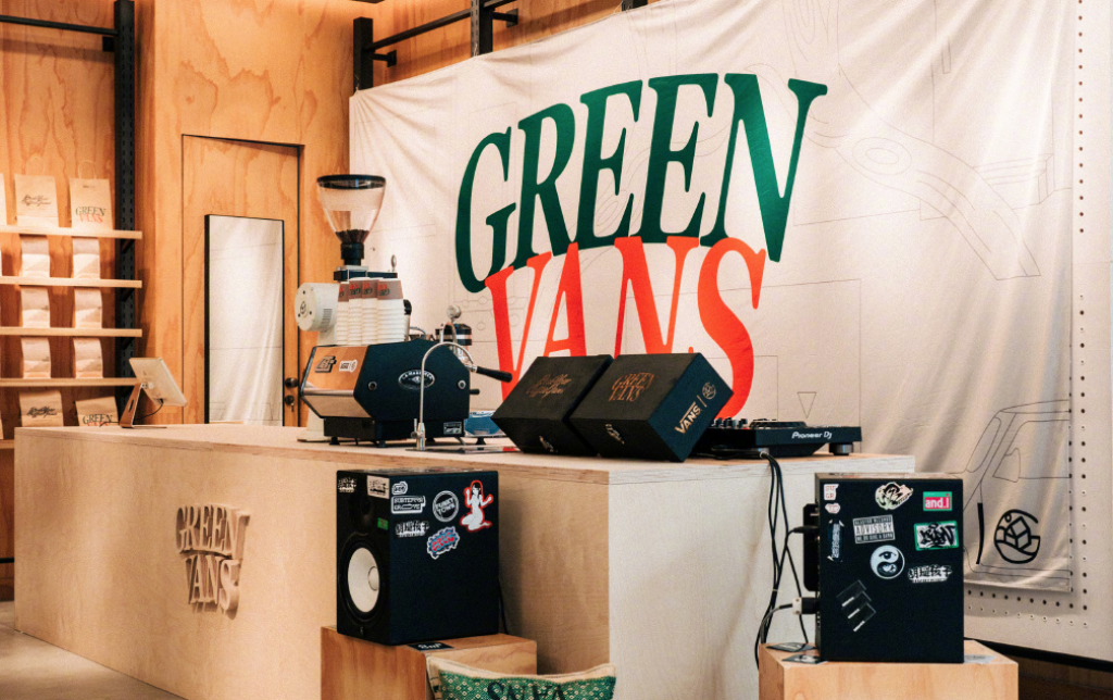 美国运动品牌 VANS 携手广州创意单位及咖啡店 GREEN HOUSE,将 VANS 广州光明广场店打造成限时三个月的 GREEN VANS 限时咖啡店,并推出限量周边。