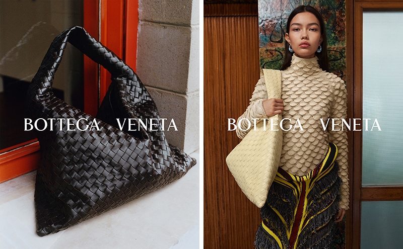 Bottega Veneta 介绍了全新推出的 Hop 手袋,它的灵感来自品牌 2002 年推出的经典 Hobo 手袋。 Hop 手袋采用纯手工制作,立体金字塔廓形源于特殊的 Intreccio 立体编织工艺,它需要由高级手工匠两天时间打造。它提供了小号和大号两种尺寸,有黑色、牡蛎紫(淡紫色)、巧克力棕(深棕色)、洋甘菊黄(浅黄色)、海妖绿(亮青色)和白色可选。
