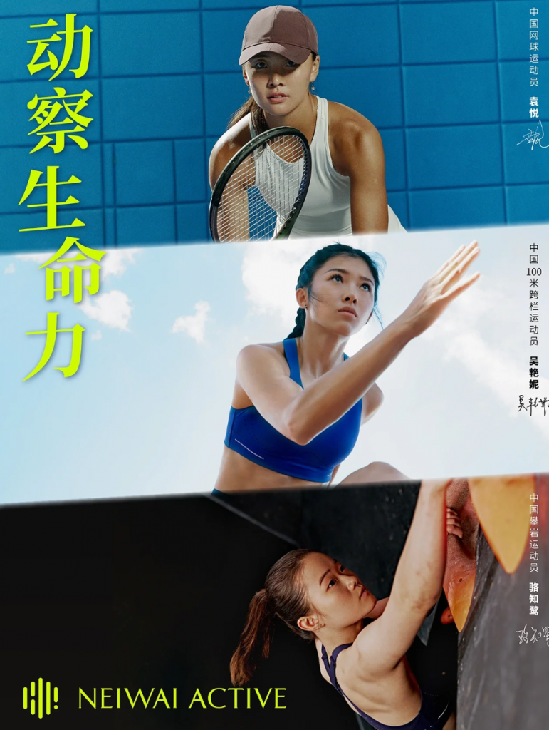 NEIWAI 内外旗下运动线 NEIWAI ACTIVE 与100米跨栏运动员吴艳妮、网球运动员袁悦、攀岩运动员骆知鹭合作,推出“动察生命力”短片,展示中国新生代女子力量。