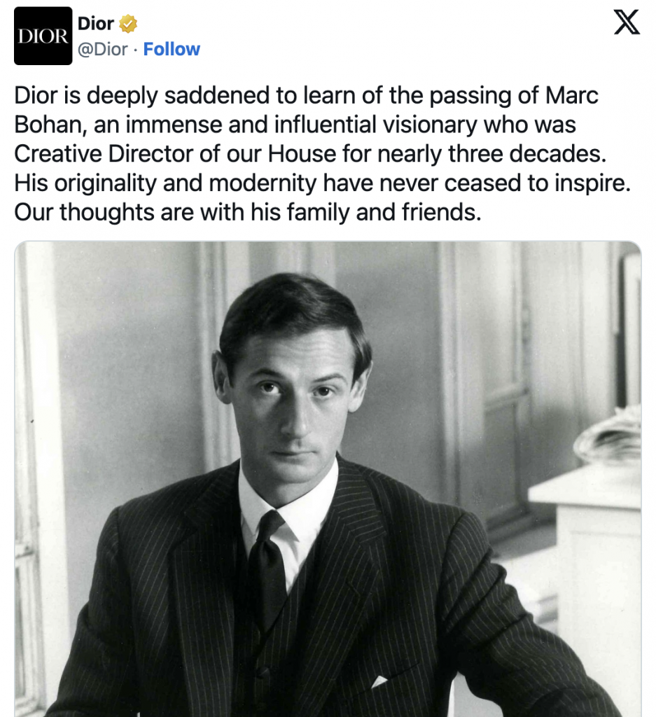 上图:Dior 在官方社交媒体平台发布了 Marc Bohan 逝世的消息