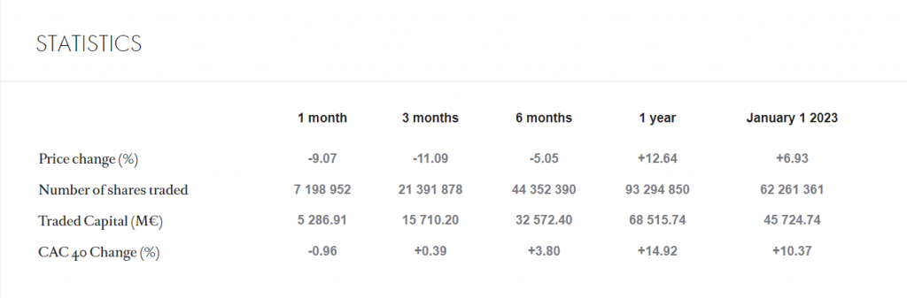 该财报公布后的下一个交易日,LVMH集团的股价曾下跌5.2%,甚至累及整个奢侈品行业和 CAC40指数。随后的8月,LVMH集团股价继续下跌 7.8%,创2022年12月以来最大单月跌幅。